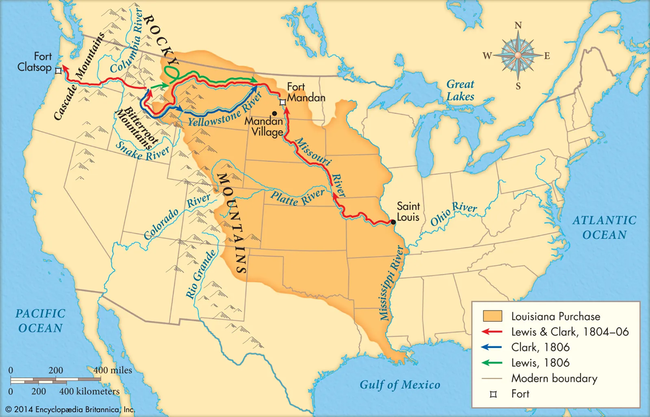 •Mapping: Use the uploaded map to draw the national boundaries of the U.S. at the time of the expedition. Outline the Louisiana purchase and trace the expedition lines, using various colors and create a color-coded key similar to the uploaded map. Be sure to appropriately label them according to the map.